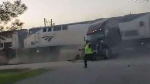 18-колёсный грузовик в прошлый вторник, 25 февраля застрял на железнодорожном переезде недалеко от города Сиболо (штат Техас, США). Момент прибытия состава, который снёс транспортное средство со своего пути, был запечатлён случайным свидетелем инцидента. Водитель фуры каким-то чудом успел покинуть салон перед самым столкновением и не пострадал.