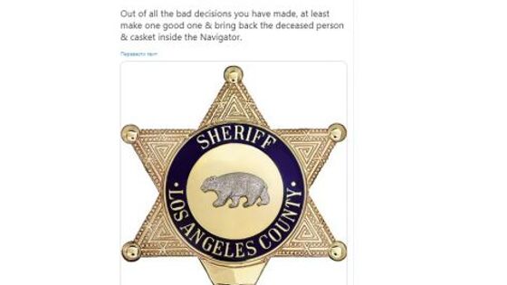В этот четверг полиция Лос-Анджелеса участвовала в погоне, достойной голливудского трагикомичного фильма. Один из местных жителей, уже давно и хорошо известный полиции, угнал прямо с прощальной церемонии катафалк с телом умершего. Автомобиль для последнего пути, выполненный на базе Lincoln Navigator, мужчина по имени Джеймс Хуарес увидел стоящим у греческой православной церкви. Нахождение в салоне гроба с телом усопшего не остановило угонщика. Местный шериф через социальные сети просил Джеймса задуматься о собственном поступке и вернуть тело родственникам. Однако Хуарес решил устроить настоящую погоню с полицией на скоростном шоссе 110. На одном из участков угонщик не справился с управлением, разбил автомобиль и попытался скрыться. Очевидец, видевший в соцсетях просьбу шерифа, заметил на трассе разбитый Lincoln и сообщил точное место в полицию. Полицейские уточнили журналистам, что ни тело умершего, ни гроб не пострадали в аварии. Правоохранители обратились к родным усопшего со своими глубокими соболезнованиями. По мнению журналистов, подобное трагикомичное преступление могло быть совершено только в «Городе Ангелов» - Лос-Анджелесе.