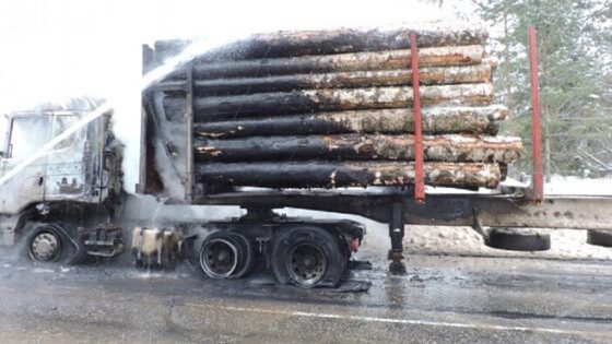 Сегодня, 3 марта, на Челябинском тракте недалеко от Арамиля загорелась фура, гружёная лесом. Очевидцы сообщили ИА «Уральский меридиан», что инцидент случился совсем рядом с заправкой «Лукойл». Водитель большегруза отметил, что сначала раздался громкий хлопок, а затем пошёл дым и фура вспыхнула. Водитель вовремя успел выпрыгнуть из кабины. В инциденте никто не пострадал. На место инцидента прибыли сотрудник МЧС. По словам специалистов ДПС, причиной происшествия послужила неисправная проводка. Фото превью: mozhga18.ru