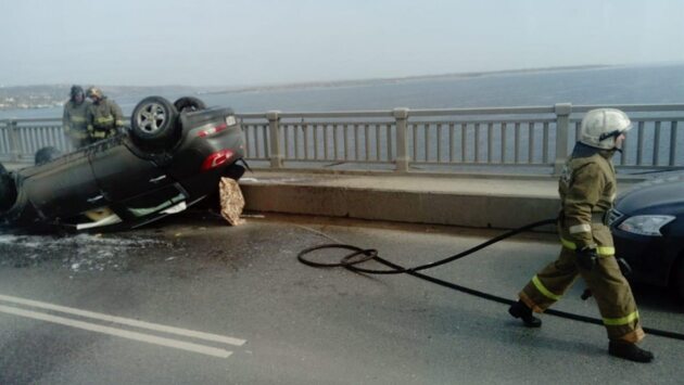 Сегодня на мосту Саратов-Энгельс произошло ДТП, сообщает пресс-служба городской автоинспекции. Приблизительно в 11:40 51-летняя женщина за рулем Kia Sportage, двигаясь по мосту, наехала на препятствие и перевернулась. В результате аварии кроссовер загорелся. Водительница госпитализирована. Обстоятельства уточняются.