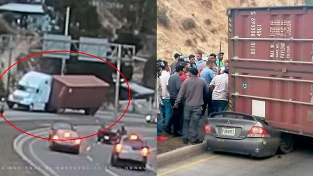 Видеокамера, установленная службой дорожной безопасности на оживлённой трассе в населённом пункте Эль Дурасно (Крус Арриба, Гондурас), 10 марта зафиксировала момент опрокидывания контейнера на легковушку. По сообщениям местных СМИ, владельцу легкового автомобиля повезло и он пережил столкновение и дождался когда спасатели освободят его из заблокированного транспортного средства, в салоне которого, к счастью, во время аварии никого больше не было. Полицейские, отправив водителя в больницу, принялись расследовать инцидент.
