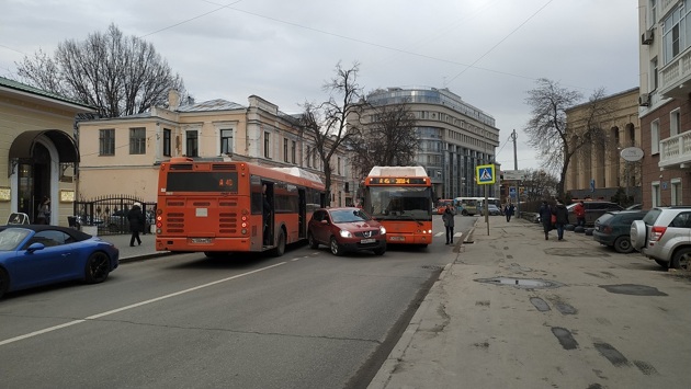Иномарку зажало между двумя автобусами на улице Минина