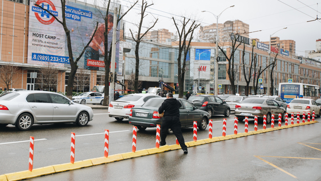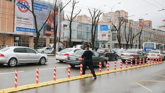 Фото: Денис Яковлев Парковка, «островок», делинеаторы: что изменилось на участке улицы Северной в Краснодаре напротив «Галереи» По крайней правой полосе на участке от улицы Красной до Рашпилевской установили делинеаторы. Это специальные разделительные столбики дорожных полос. Они нужны, чтобы машины не перестраивались там, где это запрещено. Теперь водители не смогут выезжать на правую полосу, бросать там машины, мешая движению автобусов, маршруток и троллейбусов. – Раньше на этой полосе постоянно останавливались таксисты, и было не проехать. Последние два дня, как я заметил, полоса свободная, проезжаем быстро, никто не мешает, – рассказал водитель автобуса Марат. – Очень удобно сделали. Поставили бы такие делинеаторы по всему городу, я бы им в ноги поклонился, – говорит Александр, водитель троллейбуса. Изменениями остались довольны и пассажиры, которые садятся в общественный транспорт на этом участке. – Раньше я ждала автобус минут 14, сейчас где-то минуты 3-4. Постоянно были пробки, частники бросали свои машины возле остановки, все очень наглые, хамили. Сейчас я их не вижу и автобус жду минуты 3-4, – сказала Татьяна. – Наши водители так устроены, что им по барабану запрещающие знаки. Им надо физическое ограничение возвести, а лучше огромную китайскую стену, чтобы они начали соблюдать правила! – сетует Игорь, еще один пассажир. На участке улицы Северной, рядом с Рашпилевской, между двумя светофорами в сторону ТРЦ «Галерея», сделали специальный «островок». На нем краснодарцы могут ждать сигнала второго светофора. Переход по первому участку «зебры» займет 15 секунд, потом нужно стоять на островке, ждать около минуты, пока загорится второй разрешающий сигнал светофора. Второй «зеленый» горит 5 секунд – этого достаточно, чтобы перейти на сторону «Галереи». Рядом с «островком» установили специальную парковку для таксистов. Правда, водители личных авто в упор не видят, для кого предназначена эта парковка, и ставят в «карманы» свои легковушки. Только мы с фотографом вышли на парковку, туда уже подъехал эвакуатор и забрал одну из таких машин. Но других водителей это не испугало. Спустя несколько минут на парковке для такси стали парковаться новые машины. – Только для такси? А где это написано? А, вон знак висит! Ладно, щас уеду! – отвечает нам таксист, но с места не трогается. – Мне некогда с вами разговаривать, до свидания, – говорит другой водитель и закрывает окно в машине. Тем не менее, нам удалось найти на парковке и водителя такси. Лично он остался доволен новыми парковками. – Раньше я постоянно мыкался по Северной, искал, где остановиться, было настоящее смертоубийство. Сейчас удобно: я звоню клиенту, говорю, что жду его на парковке, и машину быстро находят, – поделился впечатлениями Денис, водитель такси.