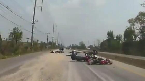 Участник дорожного движения, прокладывающий свой маршрут на автомобиле по сельской дороге в Тайланде, стал свидетелем падения группы мотоциклистов. Несколько тайских байкеров, столкнувшись с неблагоприятными дорожными условиями, в виде песка, высыпавшегося из грузовика, вынуждены были прервать свои заезды и совершить жёсткие посадки на проезжей части. Автор видеоролика в самый последний момент успел объехать мотоциклистов и остановить своё транспортное средство, никого не задавив.
