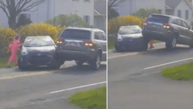 Дорожный инцидент, произошедший в небольшом населённом пункте в США, привлёк внимание случайного прохожего, который запечатлел разборку двух участником движения. Судя по кадрам записи, представительница слабого пола, управляя легковушкой, протаранила попавшийся на пути внедорожник, владелец которого отомстил неуравновешенной участнице дорожного движения и не выходя из салона, нанёс повреждения её автомобилю. Американка, видя, что оппонент не шутит, покинула салон своего транспортного средства, по капоту которого проехался тяжёлый внедорожник. Затем, получившая повреждения легковушка оказалась в кустах, но вскоре оба участника автомобильной потасовки разъехались в разные стороны.