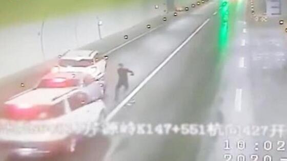 Камера наблюдения, установленная в автомобильном тоннеле Циньюаньлин (Ханчжоу, провинция Чжэцзян, юг Китая) 5 мая зафиксировала несколько столкновений автомобилей. По сообщениям СМИ, владелец белой легковушки вынужден был прервать поездку, чтобы заменить пробитое колесо. Но автомобилист не успел установить знак аварийной остановки и приступить к ремонту автомобиля, как сразу два транспортных средства врезались в его легковушку. Во время крушения автовладелец, пытаясь избежать столкновения, чудом не угодил под колёса другого автомобиля и вынужден был буквально ползком покидать проезжую часть. Со слов местных полицейских, виновником серии столкновений стали водители транспортных средств, которые не соблюдали положенную дистанцию и врезались в стоящий белый внедорожник. В результате происшествия никто серьёзно не пострадал.