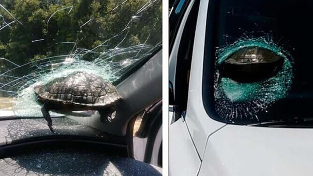 В первые мгновения женщине показалось, что в лобовое стекло Hyundai попал кирпич. И только остановившись, она поняла, что повреждение автомобилю нанесла крупная морская черепаха, которая после столкновения застряла в стекле напротив пассажира, осыпав его многочисленными осколками.