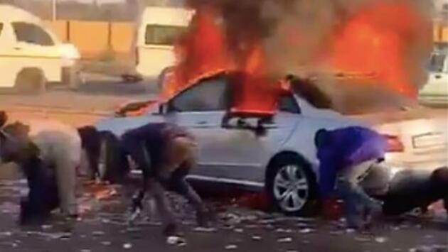 Мощным взрывом закончился налёт на бронированный фургон, перевозивший 3 мая денежные средства в городе Крюгерсдорп (муниципалитет Могале-Сити, район Уэст-Ранд, провинция Гаутенг, ЮАР). По информации СМИ, члены банды протаранили на автомобиле банковский фургон, затем угрожая оружием заставили покинуть транспортное средство водителя и инкассаторов. В результате взрывных работ, в исполнении неопытных взрывотехников, фургон и легковушка налётчиков разлетелись на куски, разметав загоревшиеся купюры в разные стороны. Один из местных жителей позже запечатлел, как его соотечественники собирали наличность, разбросанную взрывной волной по автомагистрали. «Подозреваемые скрылись с места происшествия на 3 автомобилях с неизвестной суммой денег, а также оставили разбросанную на дороге наличность. Мы объявили в розыск дерзких грабителей и местных жителей, воспользовавшихся возможностью и прикарманивших чужие деньги», - рассказала представитель южноафриканской полицейской службы полковник Бренда Муридили.