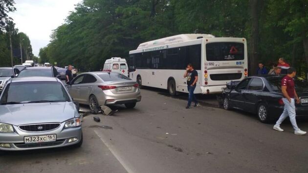 В донской столице на улице Еременко случилось массовое ДТП с четырьмя автомобилями и автобусом. Об этом сообщает отдел пропаганды ГИБДД по Ростовской области. Столкновения произошли 4 июня во второй половине дня. Автомобиль Hyundai Solaris, за рулем которого был 36-летний водитель, выезжая из двора, не уступил дорогу и столкнулся с Hyundai Sonata, которым управлял воитель в возрасте 27 лет. От этого столкновения Sonata отбросило на стоявший на остановке автобус №71. В это время в общественном транспорте было четыре пассажира, они остались целы. А второй автомобиль, Solaris, вынесло на встречную полосу, где он столкнулся еще с двумя машинами: Hyundai Accent и Subaru Tribeca. В этом ДТП пострадал водитель автомобиля Hyundai Sonata, который врезался в автобус. - Он был доставлен в больницу, - говорится в сообщении.