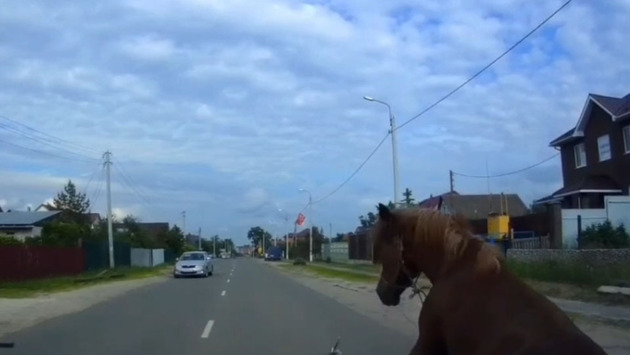 Молодое животное скакало по обочине, его «повело» под машину и оно упало прямо под колёса. Конь не пострадал, автомобиль частично повреждён.