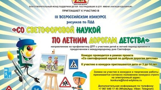 Конкурс направлен на профилактику ДТП с участием детей в летний период времени и приурочен к международному дню светофора. Конкурс направлен на профилактику ДТП с участием детей в летний период времени и приурочен к международному дню светофора. – Летом дети катаются на велосипедах, самокатах, роликах и чаще они передвигаются не по закрытым дворам, а вблизи дорог и автомобильных проездов. Поэтому профилактика дорожно-транспортных происшествий в этот период становится еще более актуальной. Мы уверены, что с помощью рисунков дети вновь вспомнят правила безопасного поведения на дороге, – отмечают организаторы. Участие в конкурсе детских рисунков могут принять все желающие от 3 до 14 лет. Для этого необходимо ознакомиться с положением о конкурсе и подать заявку на электронный адрес: konkurs@fond-edykina.ru. III всероссийский конкурс рисунков проходит с 10 июня по 10 июля текущего года. Организатор – благотворительный фонд поддержки детей, пострадавших в ДТП, имени «Наташи Едыкиной». Информационное агентство "МедиаХот".