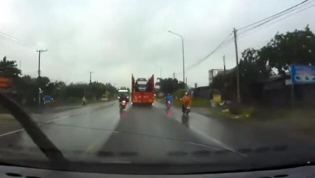 Участник дорожного движения, совершающий 14 июня поездку по автомагистрали в районе Xuân Lộc District (провинция Донг Най, Вьетнам), стал свидетелем драматичного происшествия, чуть не ставшим фатальным для мотоциклиста. «Дорога была скользкой и когда мотоциклист, разогнавшись, выехал на встречную полосу, то потерял управление и упал. К счастью, автобус просто разбил мотоцикл и человек не пострадал», - говорится в описании к видеоролику.