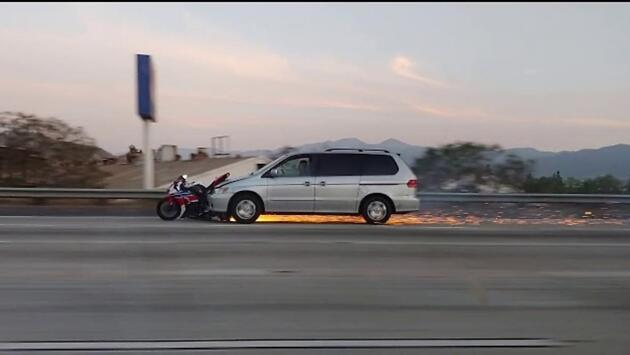 В прошлую пятницу, 19 июня участники дорожного движения, передвигаясь на автомобиле по шоссе в городе Корона (округ Риверсайд, штат Калифорния, США), стали свидетелями необычного инцидента. Водитель минивэна, не поделивший автотрассу с мотоциклистом, лишил его транспортного средства. Очевидцы происшествия запечатлели необычную процессию и торчащий из-под капота автомобиля мотоцикл, извергающий искры. По информации СМИ, в результате происшествия мотоциклист отделался синяками и ссадинами. Автомобилист, бросивший минивэн и продолживший свой путь пешком, был объявлен в розыск.