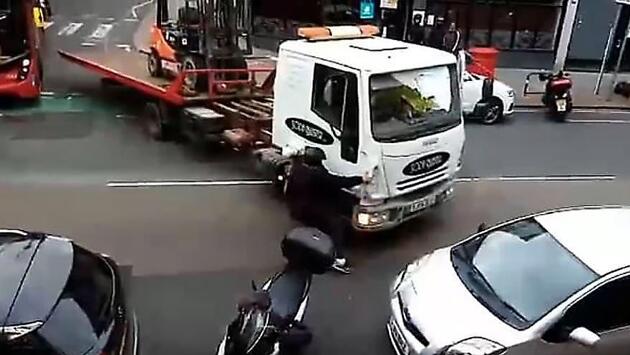 В прошлую пятницу, 19 июня момент бегства стоящего на уклоне дороги грузовика, с вилочным погрузчиком на платформе, попал на видеокамеру на улице Кройдон Хай-стрит, в южной части Лондона. Работник транспортной компании, остановившийся на повороте, чтобы проверить правильность закрепления груза на площадке, забыл поставить на ручной тормоз свой эвакуатор. В итоге покатившееся транспортное средство столкнулось с заходящим на поворот автобусом, а затем, благодаря стараниям мотоциклиста успевшего погасить скорость, совершило «мягкий наезд» на припаркованную легковушку. Со слов очевидцев инцидента, никто из участников дорожного происшествия не пострадал.