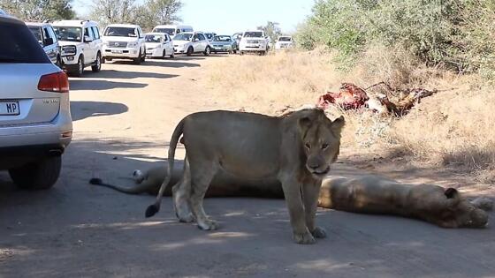 Многочисленные туристы, прибывшие на автомобилях в национальный парк Крюгера, вынуждены были провести некоторое время в томительном ожидании, когда хищники освободят дорогу для проезда. «Львы остановили движение и вызвали огромную пробку на дороге в парке Крюгера. Это один из самых больших заторов, которые я когда-либо наблюдал во время посещения посещении заповедника. Тем не менее, пробка выявила лучших и худших водителей. Владелец белого пикапа, распугавший отдыхающих хищников - отличный пример того, как не надо вести себя на территории заповедника. Эта земля принадлежит животным и все посетители должны соблюдать их правила», - говорится в описании к сюжету.