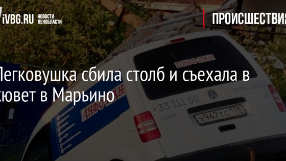 Сегодня днем, 28 июня, в группе "ДТП и ЧП СПб" соцсети "ВКонтакте" очевидец сообщил об аварии в деревне Марьино Ломоносовского района. Уточняется, что машина провайдера попала в аварию. Судя по фото, она является единственным участников аварии — машина сбила столб освещения и съехала в кювет. О пострадавших не сообщается.