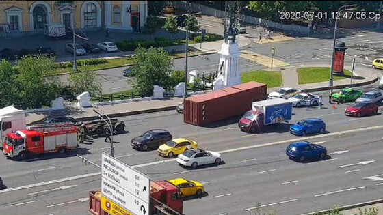 На Тверском путепроводе Москвы упал контейнер с фуры