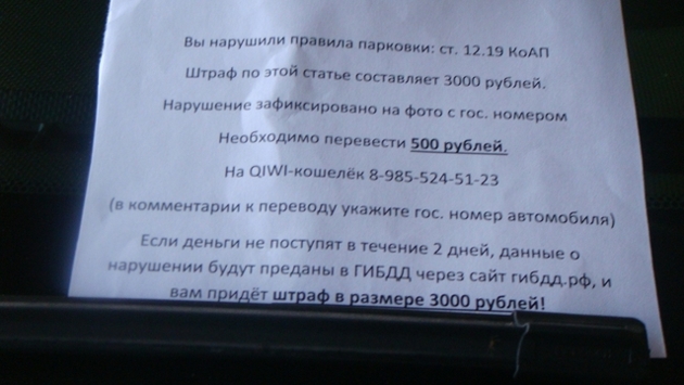 Оказывается, в Калининграде за нарушителями правил парковки следят теперь не только инспекторы ГИБДД. Необычное послание на капоте своей машины обнаружила жительница областного центра. Им она поделилась в паблике «Сообщество автомобилистов Калининграда и области» во «ВКонтакте». В записке было сказано, что хозяйка автомобиля нарушила правила парковки и это зафиксировано на фото. Автор сообщения предлагает перевести на его QIWI кошелек 500 рублей и дает на это два дня. Если деньги не будут переведены, то фотография отправится в ГИБДД. Тогда придется оплатить штраф в размере трех тысяч рублей, угрожает шантажист. Калининградка не уточняет, ставила ли она свою машину в неположенном месте или нет. В комментариях калининградцы успокоили женщину, объяснив, что это очередная уловка мошенников. Этому верить не следует.