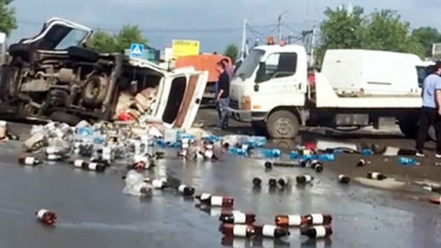 В Кировском районе Новосибирска опрокинулся грузовик с пивом