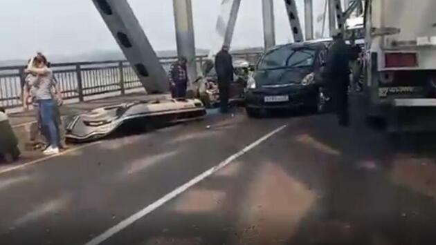На мосту через Амур ведущем из Комсомольска-на-Амуре произошло ДТП с участием грузовика и легкового автомобиля, сообщает ИА «Хабаровский край сегодня». По предварительным данным, автомобиль Тойота Кариб двигался в сторону Комсомольска-на-Амуре, а 10 тонный грузовик Хино в противоположном направлении, и на мосту случилось лобовое столкновение. На место прибыли сотрудники скорой помощи и спасатели. Хотя легковой автомобиль визуально пострадал больше, его пассажиры получили меньше травм. Возможно, благодаря тому, что грузовик был без груза. - В легковом автомобиле находился ребёнок 10 лет, на момент прибытия спасателей он уже находился вне автомобиля, его состояние стабильное, сейчас его осматривают медики. Водитель Кариба также получил травмы, в основном ссадины, больше всего пострадал водитель грузовика, его в результате аварии зажало в кабине, и нам пришлось использовать гидравлический инструмент, - сообщил начальник поисково-спасательного отряда Центра гражданской защиты Комсомольска-на-Амуре Андрей Аверин. Водитель грузовика получил травму правой ноги, скорее всего перелом с кровотечением, и правой руки, но перелома визуально нет. Его осматривают и отправят в больницу. Кто стал виновником ДТП должны определить сотрудники ГИБДД. Ранее агенство сообщало, о старте работ по ремонту автомобильного моста через Амур у Комсомольска. В результате этих работ, движение на мосту осуществляется по одной полосе.