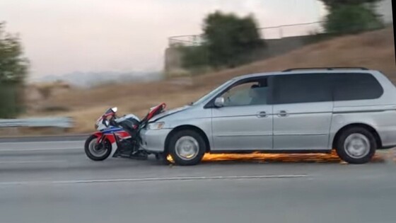 Вероятно, невозмутимый водитель минивэна ожидал, что никто на дороге не обратит внимания на "украшение" его капота. Его засняли удивленные очевидцы на магистрали State Route 91 в Калифорнии. По данным Калифорнийского дорожного патруля, минивэн ехал со скоростью около 112 км/ч, когда врезался в заднюю часть мотоцикла. Чудом почти не пострадавший мотоциклист рассказал местным СМИ, что ударом его отбросило примерно на 60 метров от места аварии. Водитель минивэна, 25-летний Джорж Валентин, решил не останавливаться и попытался скрыться. Вместе с ним место ДТП покинул и смятый мотоцикл, от которого по дороге тянулся шлейф из искр. В какой-то момент Валентину все же удалось избавиться от "груза" – полностью разрушенный от удара и долгого скольжения по асфальту мотоцикл нашли на обочине дороги. Неподалеку был найден и брошенный минивэн виновника, который врезался в ограждение. Вскоре стражи порядка нашли и самого Валентина. Мужчину арестовали, когда он пытался заявить об угоне минивэна. Позже он сознался, что сам был за рулем автомобиля, и был обвинен в оставлении места аварии. Мотоциклист рассказал о еще одном странном обстоятельстве ДТП: по его словам, авария выглядела намеренной – Валентин будто специально врезался в мотоцикл. "Как будто он следил за мной", – сказал мужчина журналистам телеканала CBS.