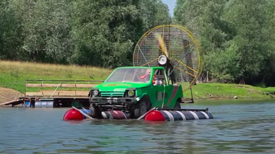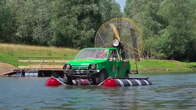 Авторы Youtube-канала «Гараж 54» решили построить на базе советской «Оки» водоплавающий автомобиль. После модификаций и установки дополнительного оборудования компактная машинка отправилась в первое плавание. Кроссовер Suzuki Jimny научили плавать Для реализации своей идеи авторы проекта приобрели старую «Оку», освежили ее кузов и установили дополнительный передний бампер, украшенный хищным оскалом. Заднюю часть кузова автомобиля блогеры удалили для крепления огромного вентилятора, наподобие тех, что устанавливаются на аэроджипы. Чтобы «Ока» сразу не пошла ко дну, для самодельной амфибии изготовили понтон из шести бочек, соединенный в импровизированный плот, на котором и разместили автомобиль. Для управления водоплавающей моделью инженеры установили рулевую рейку, которую соединили с рулевым колесом. Отправившись на ближайший водоем, блогеры решили испытать плавучесть и управляемость своей амфибии, однако в процессе погрузки автомобиля плот внезапно начал отдаляться от берега, в результате чего автомобиль стал тонуть, оказавшись по лобовое стекло в воде. Со второй попытки инженерам удалось спустить «Оку» на воду и даже проплыть на ней по реке при помощи аэротяги, получаемой от вентилятора. В результате испытаний скорость передвижения по воде оказалась не более двух-трех километров в час, однако управлять таким транспортным средством оказалось возможно. Несколько дней назад другие российские блогеры опубликовали видео, в котором превратили Lada Xray в амфибию. В результате модификаций на автомобиль установили дополнительные листы из пенопласта, а также подвесной лодочный мотор, благодаря которому водоплавающая машина смогла отойти на несколько метров и вернуться на берег. Источник: YouTube/Гараж 54 Автомобили как пароходы