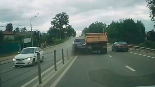 На данный момент информация о пострадавших не сообщается. В Подмосковье из-за неудачного маневра водителя грузового автомобиля легковушка оказалась «впечатана» в дорожное ограждение. Видео с места ДТП было опубликовано в Сети. На кадрах с видеорегистратора хорошо видно, как водитель грузовика пытается перестроиться вправо, однако «летящая» сзади легковушка заставляет его вернуться обратно. Из-за того, что большегруз резко и неожиданно вильнул обратно влево, то легковой автомобиль, вставший на его место, оказался прижат к дорожному ограждению. Водитель грузового автомобиля после ДТП с места произошедшего скрылся. Никакой информации о пострадавших на данный момент не сообщается.