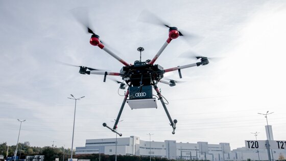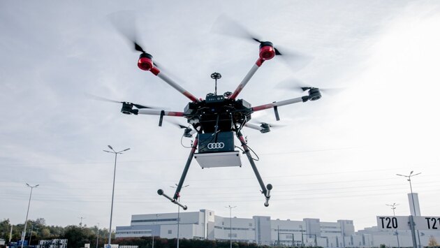 Концерн Audi внедрил дроны для работы на заводе в Неккарзульме — специально разработанная система из нескольких беспилотных летательных аппаратов позволяет персоналу ориентироваться в большом количестве автомобилей, которые сошли с конвейера и ожидают отправки клиентам. Ежедневно завод выпускает сотни моделей — седан Audi A4, кабриолет Audi A5, линейку Audi A6, 4-дверное купе Audi A7, седан Audi A8, а также спорткар Audi R8 — и каждый из автомобилей предназначен конкретному клиенту в разных странах мира, поэтому сотрудникам приходится перед отправкой машин находить их и формировать партии для отгрузки клиентам. Чтобы людям не приходилось обходить огромную парковку, в Audi задействовали гексакоптер (дрон с шестью пропеллерами) с установленным на нём считывателем RFID-меток. На конвейере каждый автомобиль получает собственную метку, в которой хранится VIN-код машины и другая информация о ней, а затем дрон, пролетая над парковкой на высоте 10 метров, считывает эти сведения. Данные о местонахождении конкретного автомобиля фиксируются с помощью GPS. После приземления через Wi-Fi вся собранная информация загружается в базу данных, откуда она выводится на цифровые карты для сотрудников Audi — затем специалистам легко найти необходимую машину, имея её координаты на парковке. Дрон полностью автономен — взлетает, летит и садится самостоятельно — но при необходимости четыре специально обученных работника, получивших лицензию на управление беспилотником, могут взять контроль в свои руки. Дрон перед вылетом получает информацию о погоде в окрестностях Неккарзульма — если слишком сильный ветер или осадки, то беспилотник не отправится в полёт. Также дрон останется на земле, если батарея разряжена. Проект по использованию беспилотников на заводской парковке пока проходит в пилотном режиме. Если результаты работы дронов в Неккарзульме будут признаны успешными, то Audi может распространить эту практику и на другие свои заводы.