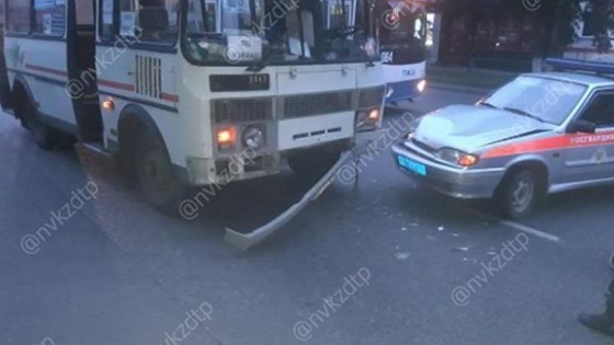 Автомобиль с символикой Росгвардии врезался в автобус в Новокузнецке: пострадала женщина