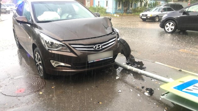 Рязанка на Hyundai столкнулась с Peugeot и снесла дорожный знак