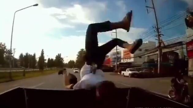 Тайский подросток вылетел из мотоцикла и оказался в кузове пикапа после столкновения с ним