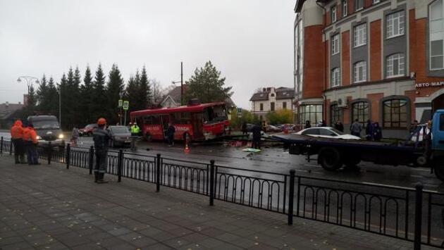 Днем 23 сентября в Тобольске на ул. Октябрьская неподалеку от Кремля произошло массовое ДТП Автобус местного пассажирского предприятия снес фонарный столб и опору с камерами ведеофиксации, также было повреждено несколько автомобилей. Об этом сообщили в Тобольском отделе ГИБДД по Тюменской области. Очевидцы говорят, что автобус подрезал легковой фольцваген, который попытался повернуть со среднего ряда налево на улицу Ленская. По их словам женщину из фольцвагена в результате ДТП увезли в больницу, также травмы получили водитель и кондуктор автобуса. Пассажиров в автобусе не было. По словам источника в пассажирском предприятии, которому принадлежит автобус, он завершив рейс высадил пассажиров у Кремля и поехал на обед. При этом источник сообщил о крупном ущербе — счет за аварию по его словам «потянет на несколько миллионов». «Водитель 1956 года рождения, управляя автомобилем Фольксваген Туран, нарушила правила расположения транспортного средства на проезжей части при повороте налево, в результате чего допустила столкновение с автобусом ЛИАЗ. В результате столкновения автобус допустил наезд на фонарный столб со светофорным объектом и опору видеофиксации, фонарный столб повредил стоящее рядом иномарки. В результате происшествия получили телесные повреждения водитель автомобиля Фольксваген Туран и пассажир (кондуктор) автобуса 1972 года рождения», - сообщили в ведомстве. Фото: Криминальный Тобольск ВКонтакте