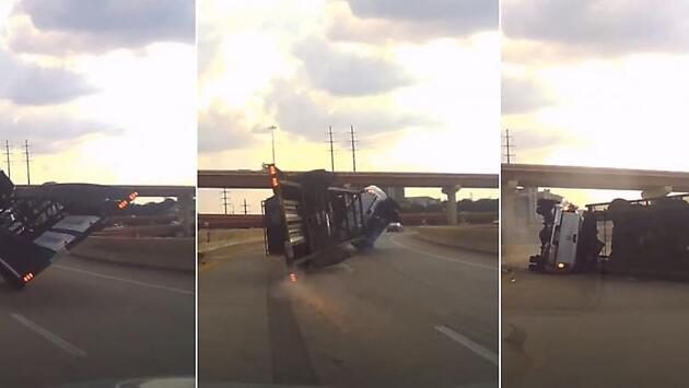 Участник дорожного движения, совершающий 17 сентября путешествие на автомобиле в черте города Ирвинг (штат Техас, США), на участке дороги Даллас-Форт-Уэрт, стал свидетелем крушения пикапа, эвакуирующего дорогостоящий автомобиль. Водитель пикапа, проходя поворот, не рассчитал скорости и веса гружёного прицепа, в результате чего не справился с управлением и завалил своё и транспортируемое транспортные средства на бок. Со слов автора видео, виновник инцидента не пострадал.