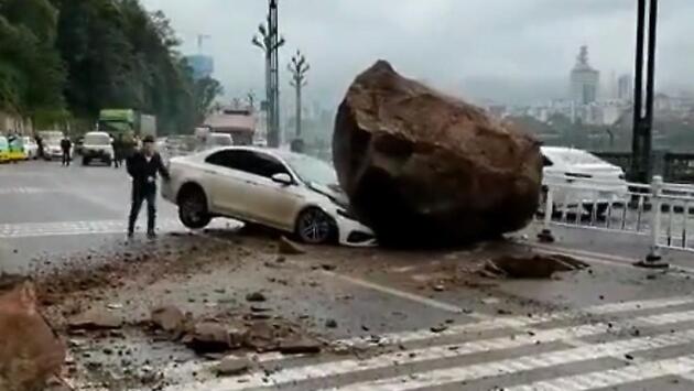 Гигантский валун, скатившийся с холма, лишил легковушки удачливого автовладельца - видео