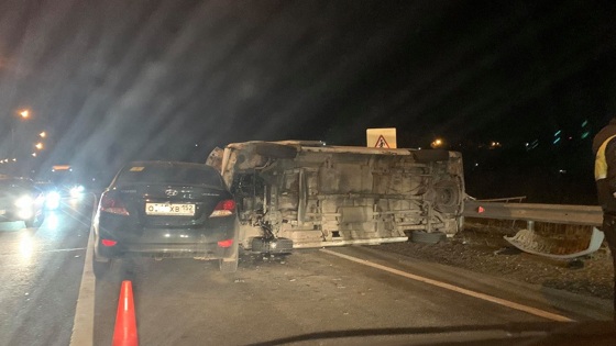 Микроавтобус в результате ДТП перевернулся на бок. Перекрыты две полосы движения. На трассе образовалась автомобильная пробка. По информации сервиса Яндекс. Пробки, затор растянулся более чем на километр.