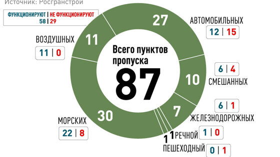 В число данных пунктов пропуска (ПП) вошли морские - Ванино, Петропавловск-Камчатский, Холмск, Невельск, Находка, Корсаков и Восточный, железнодорожные - Нижнеленинское, Пограничный, Наушки и Забайкальск, автомобильные - Марково, Кани-Курган, Забайкальск, Краскино, Турий Рог, Полтавка, Монды, Кяхта, Пограничный и Староцурухайтуйский, воздушный - Петропавловск-Камчатский (Елизово). Их доля в общем объеме грузооборота по ДФО составляет 77 процентов (а в целом на округ приходится больше четверти общероссийской перевалки грузов через госграницу).