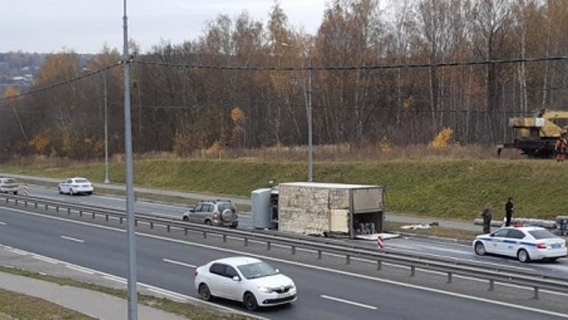 На объездной дороге рядом с Калугой перевернулся грузовик с пивом