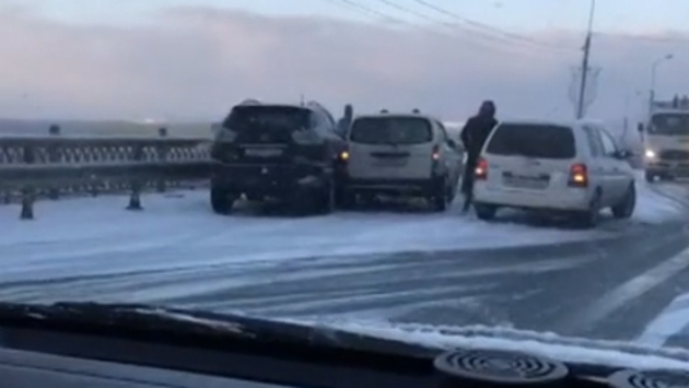 Первое столкновение на заснеженной дороге случилось между водителями Toyota Probox и Lexus. Затем ещё две машины не смогли вовремя затормозить в потоке – Subaru и Mazda.