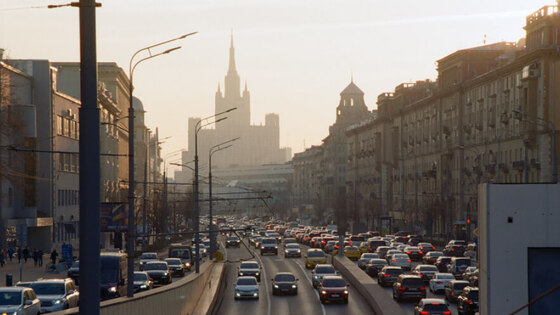 Транспорт встал в очередную пробку в центре Москвы по причине ДТП с участием полицейской машины. На дороге перекрыто две полосы движения.