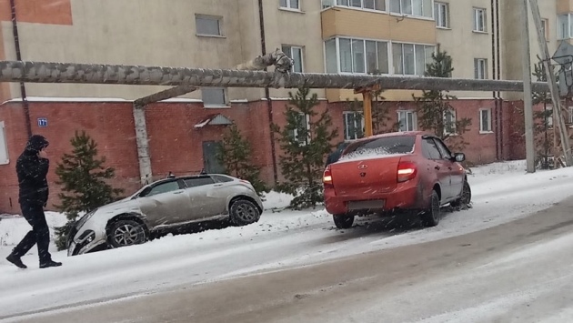 Очевидцы поделились кадрами с результатами аварии в одном из кузбасских городов. Один из автомобилей оказался в кювете.