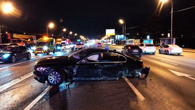 На опубликованных в сети фото видно, как BMW с мигалкой и номером серии АМР стоит посреди Кутузовского проспекта без колеса и с помятой левой стороной.