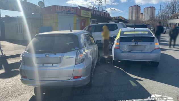 Авария произошла на улице Борисенко, 102. Как утверждается в источнике, водитель за рулем Honda Fit выезжал со второстепенной и не пропустил Toyota Prius, который после столкновения отлетел в припаркованный Toyota Land Cruiser Prado.