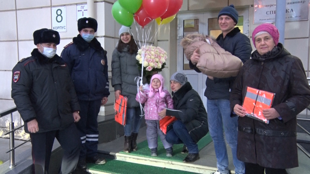 Сотрудники полка ДПС ГИБДД поздравили тюменку Карину Вагапову с рождением дочки, встретив ее при выписке из перинатального центра. Автоинспекторы вручили женщине воздушные шары и световозвращающие подарки для двух ее дочерей. Карина и ее муж Алексей поблагодарили полицейских за оперативное доставление женщины в лечебное учреждение. Алексей Серегин обратился к наряду ДПС на ул.30 лет Победы в Тюмени с просьбой сопроводить в перинатальный центр его автомобиль, в котором он вез рожающую жену. Автоинспекторы полка ДПС ГИБДД старший лейтенант полиции Александр Ришат Мамбетов и лейтенант полиции Егор Секисов оперативно сопроводили автомобиль в перинатальный центр. Через 15 минут у Карины Вагаповой родилась дочка Виолетта. «Я думала, что полицейские вряд ли согласятся помочь нам, ведь у них свои служебные задачи, - рассказывает Карина Вагапова, - Но они сразу согласились помочь. Благо у нас сотрудники полиции относятся к нам гражданам больше, чем к работе. Они нас проводили с сиреной и маячками, благодаря этому я родила дочку не в машине, а там, где нужно. Огромная благодарность, что мы родились в роддоме! Очень приятно, что есть такие сотрудники в полиции!» - отметила Карина Вагапова.