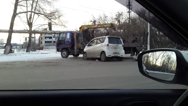 Жительница Кузбасса опубликовала фото ДТП с участием легкового автомобиля и эвакуатора.