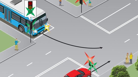 Как это видно на картинке, красному автомобилю светит зеленым дополнительная секция светофора. Следовательно, он должен пропустить всех, с кем у него может пересечься траектория движения. Поэтому легковой автомобиль должен сперва пропустить автобус (п. 13.5 ПДД РФ), а затем уже продолжить движение. За несоблюдение полагается штраф 1 000 рублей (ч. 2 ст. 12.13 КоАП РФ).