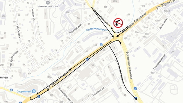 Проехать нельзя со стороны ул.Шатурской. Чтобы добраться до нужной точки необходимо на перекрестке с Орудийной повернуть направо (развернуться у Аэропортной), либо прямо по Гагарина (до Куйбышева и развернуться).