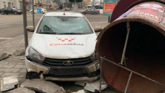 В центре Ростова автомобиль такси снес рекламную тумбу