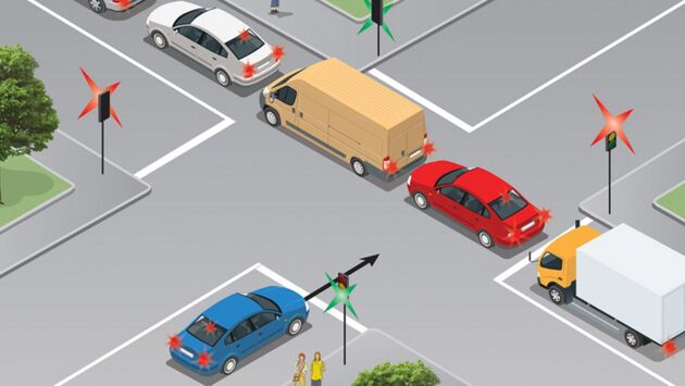 Для жителей больших городов дорожные пробки дело неприятное, но обыденное. Постарайтесь максимально быстро ответить на вопрос: "Можно ли синему автомобилю начать движение, когда загорится зеленый свет?".