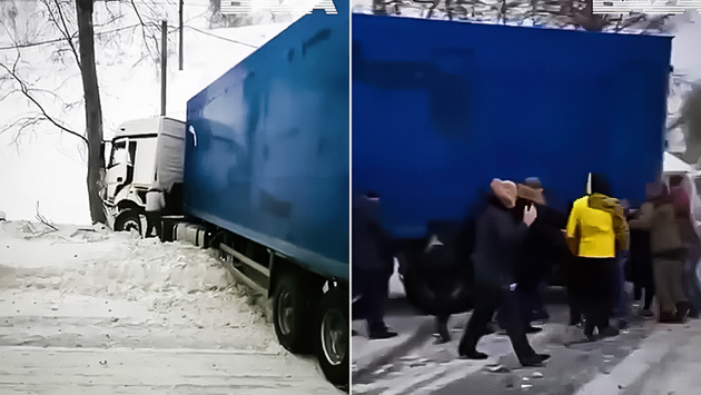 На видео, опубликованном в телеграм-канале Baza, запечатлен момент, как сибиряки вручную передвигают многотонную фуру. Несколько десятков мужчин обступили автомобиль и развернули его, освободив проезд.