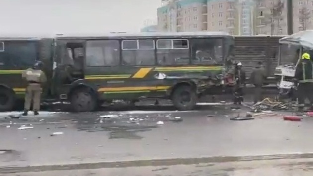 Грузовик протаранил колонну военных автобусов на Новорижском шоссе в Подмосковье